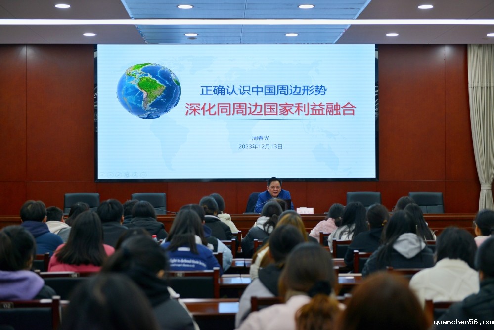 12月13日下午,党委副书记、校长周春光研究员在崇德楼315会议室以《正确认识中国周边形势 深化同周边国家利益融合》为题,为师生主讲专题思想政治理论课。医学院、艺术学院、旅游学院师生代表参加了学习。