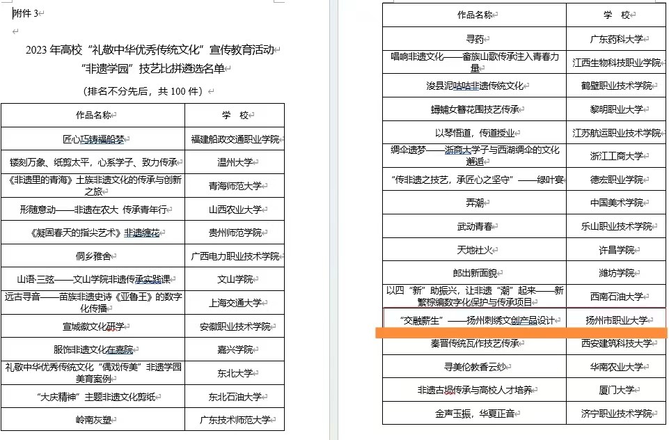 近日,教育部思想政治工作司公布2023年高校“礼敬中华优秀传统文化”宣传教育活动结果。我院报送的《“交融薪生”——扬州刺绣文创产品设计》成功入选“非遗学园”技艺比拼优秀项目。