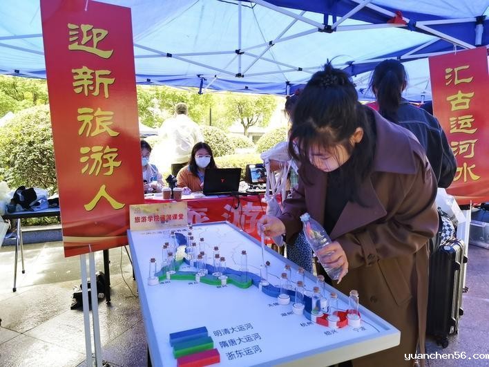原来,早在开学前,学院就给新生们布置了一个特殊的作业:住在运河沿线地区的同学们可带来家乡的运河水,其他地区的同学则带来一罐家乡的土。报到现场,来自杭州的新生王秋怡带来了家乡的水。只见不同地区的水被灌注在小小的玻璃瓶里,立在地图上的各个运河沿线城市点上。