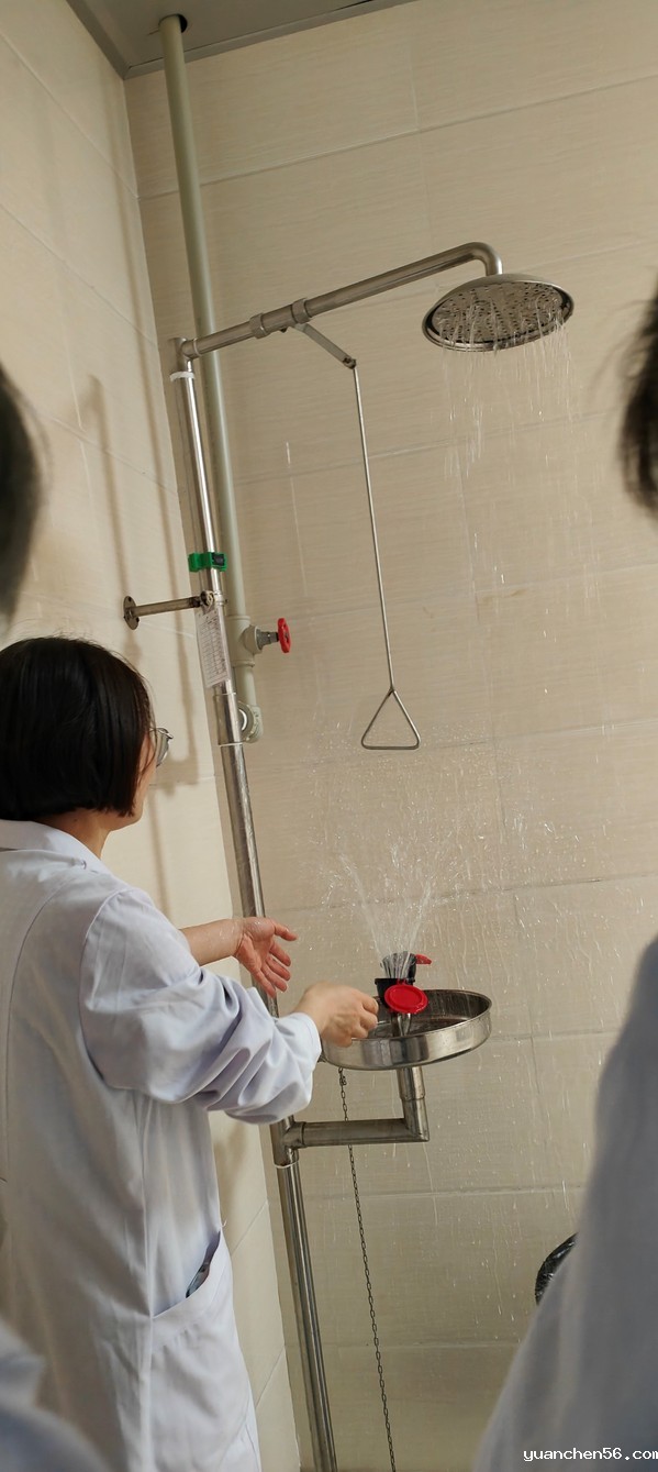 在实验过程中,如果不慎致使化学试剂溅到皮肤上,协同人员立即引导受伤学生到达紧急喷淋装置处进行清洗,并打开窗户通风,完毕后涂抹相应保护药品。